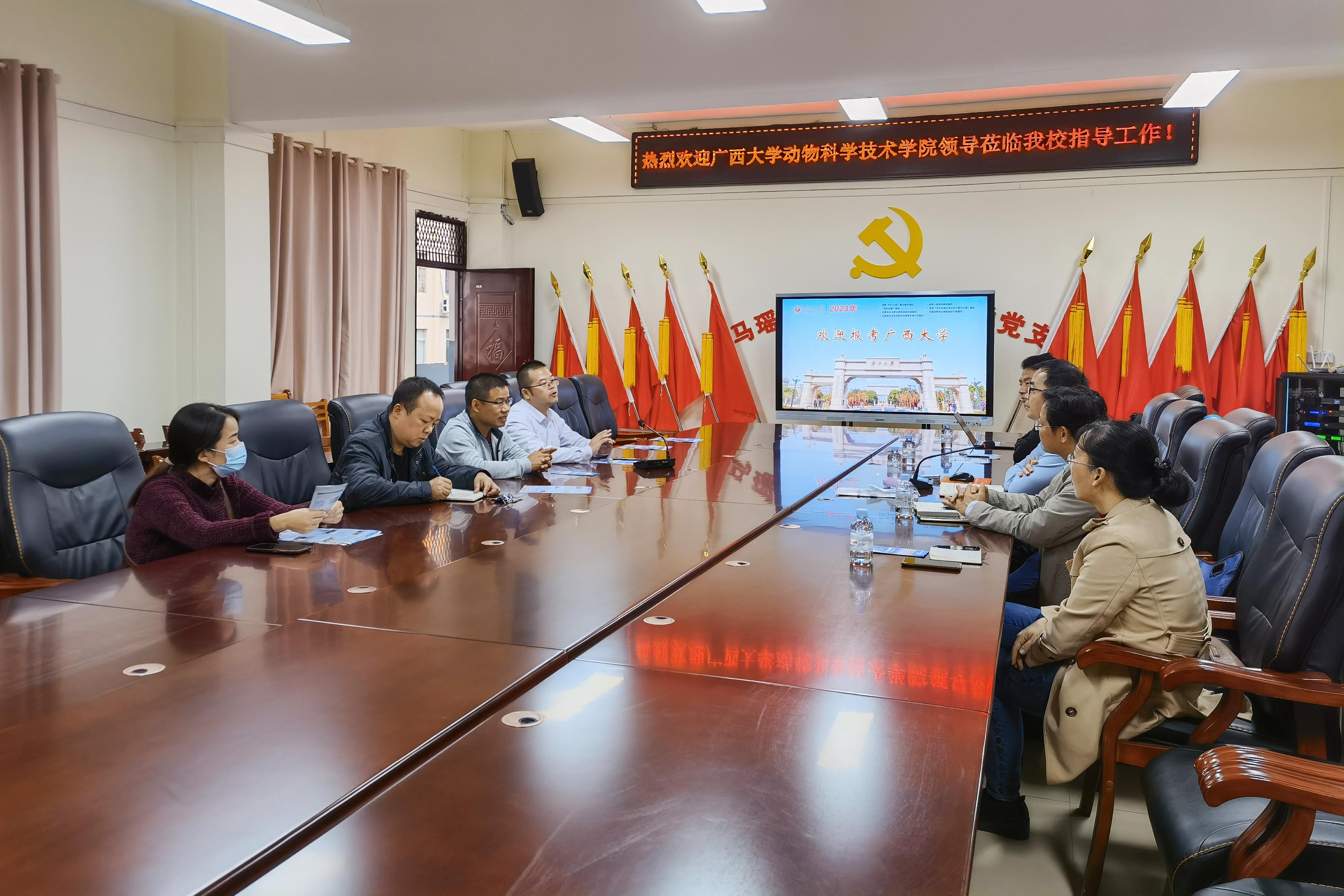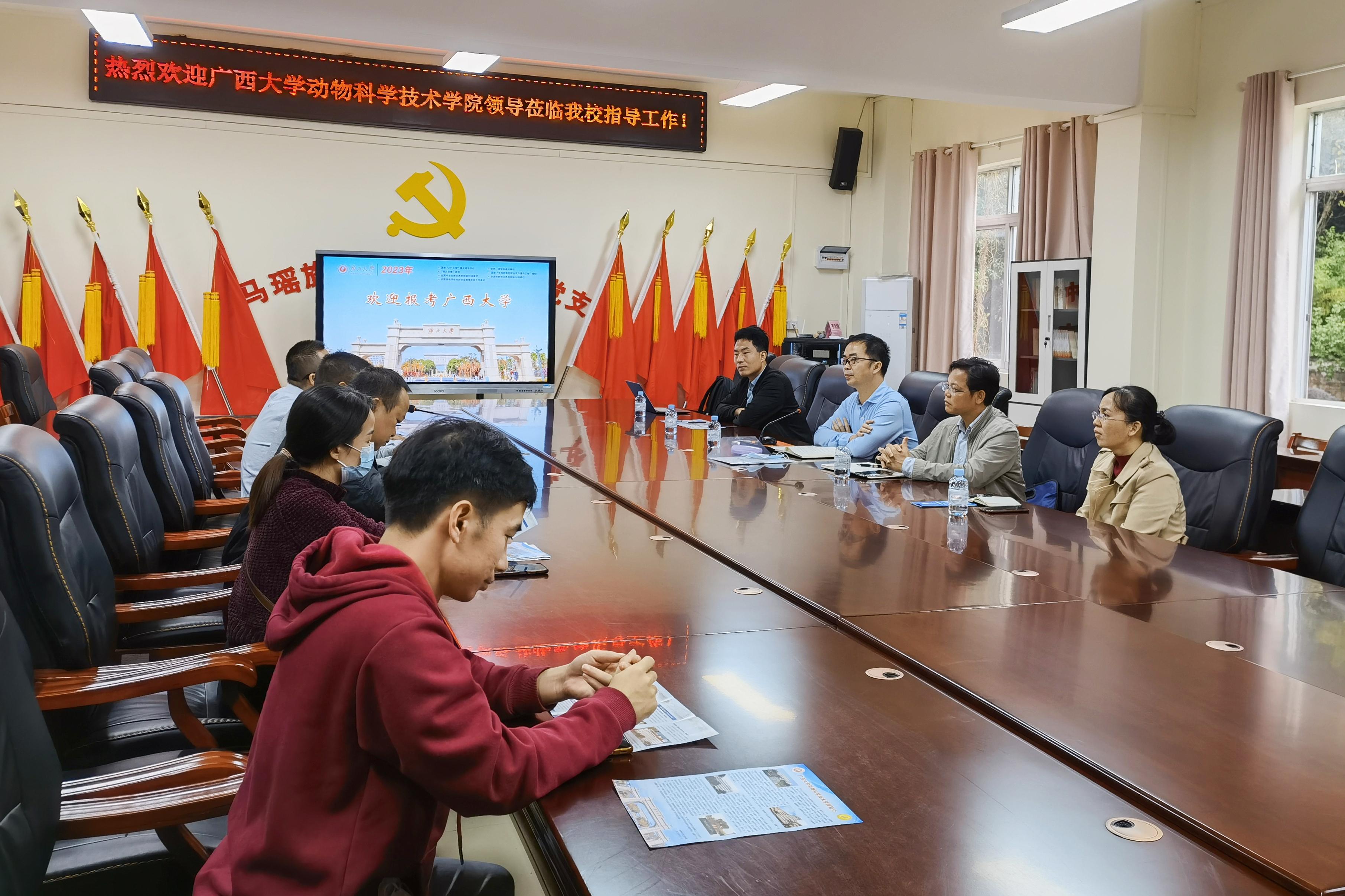 为进一步加大学校招生宣传力度,加强与区内优质中学的沟通联系,11月24日至25日,36365线路检测登录入口常务副院长陆阳清,副院长何家康,动物医学系主任陈樱,动物科学系副主任李辉,团委副书记刘诚先后走访都安瑶族自治县高级中学、巴马瑶族自治县高级中学、凤山县高级中学等3所自治区示范性普通高中。