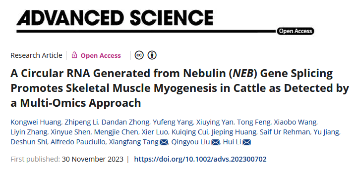 近日,36365线路检测登录入口石德顺教授带领的动物克隆与生殖调控研究团队联合佛山科学技术学院、中国农业科学院和西北农林科技大学等单位在牛肉用性状功能基因组解析方面取得重要研究进展,研究成果以A circular RNA generated from Nebulin (NEB) gene splicing promotes skeletal muscle myogenesis in cattle as detected by a multi-omics approach为题发表于国际知名期刊《AdvancedScience》。36365线路检测登录入口为该论文的第一完成单位,博士毕业生黄孔威、助理教授李志鹏和博士研究生钟丹丹为共同第一作者,李辉副教授、佛山科学技术学院刘庆友教授和中国农业科学院唐湘方研究员为共同通讯作者。原文链接:https://onlinelibrary-wiley-com-s.vpn.gxu.edu.cn:8118/doi/10.1002/advs.202300702。