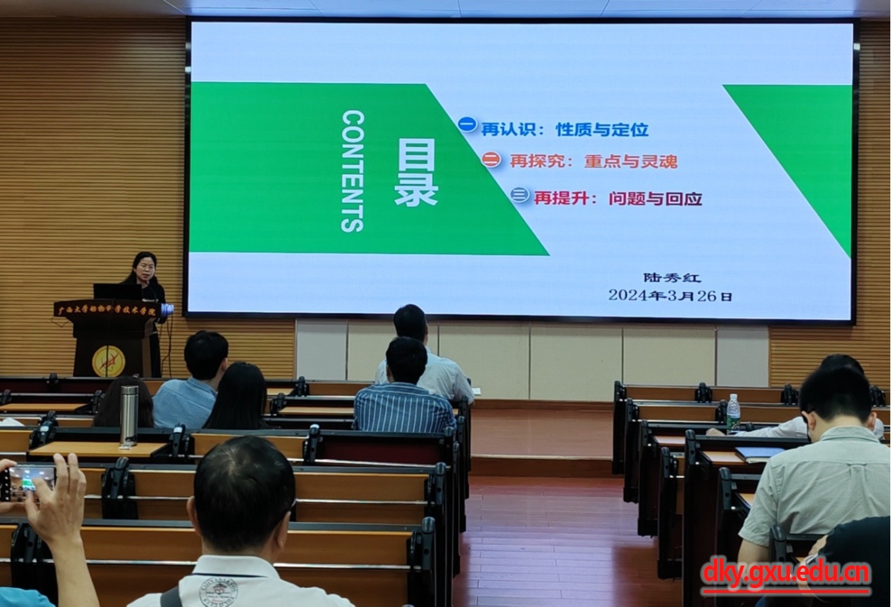 本次培训邀请了广西高校课程思政教学名师、36365线路检测登录入口马克思主义学院副院长陆秀红教授进行专家主题讲座。陆秀红教授现任广西高校“习近平新时代中国特色社会主义思想概论”课程教指委副主任委员,广西高校课程思政专家咨询委员会委员。会议开始后,陆秀红教授做了题为“课程思政:寻找课程的灵魂”的专家报告,报告分别就课程思政教育的性质和定位、专业课程思政教育的重点与整体设计、专业课程思政教育的问题与回应等方面进行了阐述,同时对于动科院如何提高专业课程思政的针对性、挖掘本学院本专业课程思政资源、讲好专业故事提出了可行性建议。会议对于帮助教师们进一步开拓专业课程思政教学的思路,创新课程思政教学模式,提供了有益的参考。