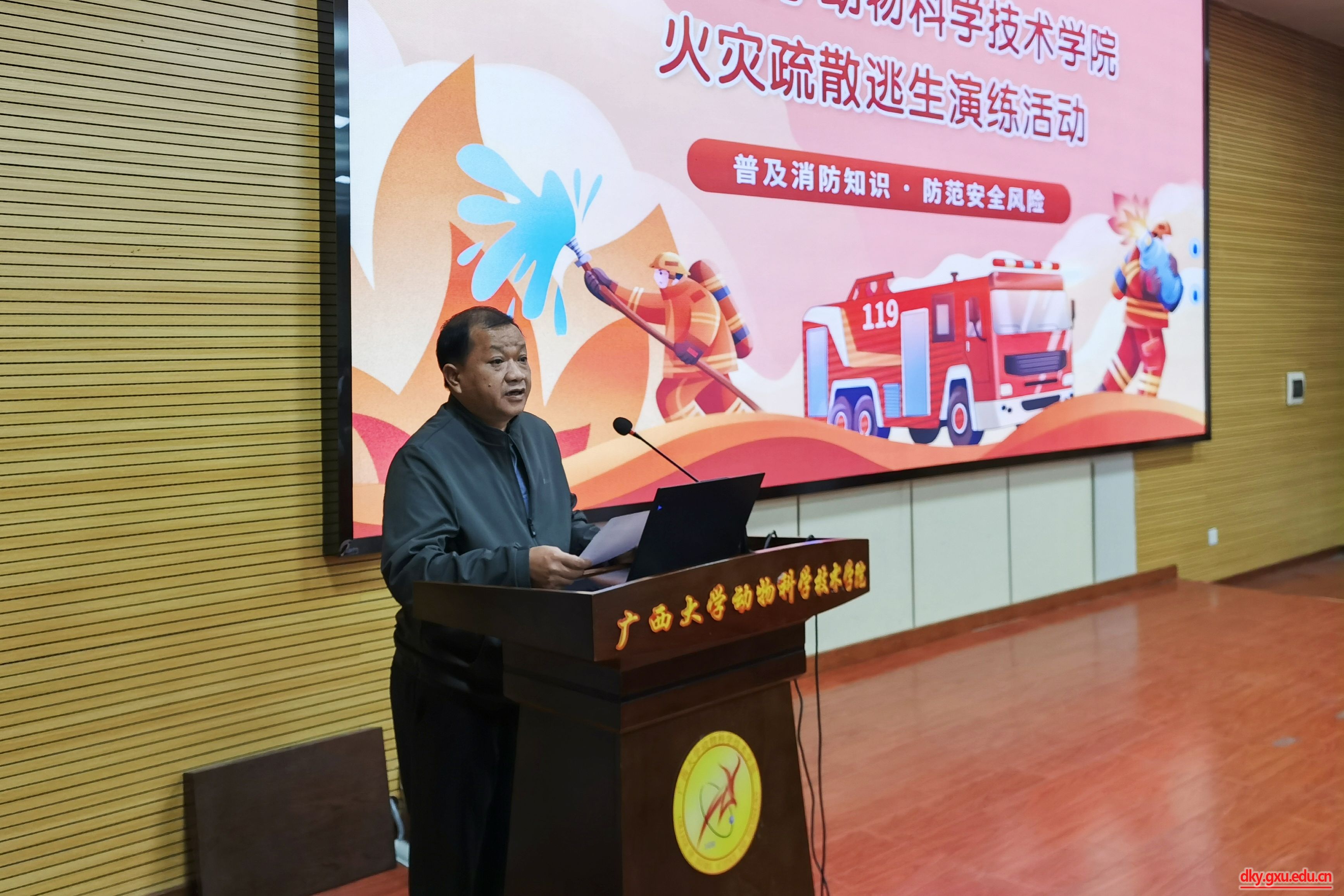 演练前,宁鹏飞老师作动员讲话。他强调,师生们在工作、学习中应强化消防安全意识,掌握消防器材使用、火灾应急处置方法,提高安全防范和自救逃生能力。