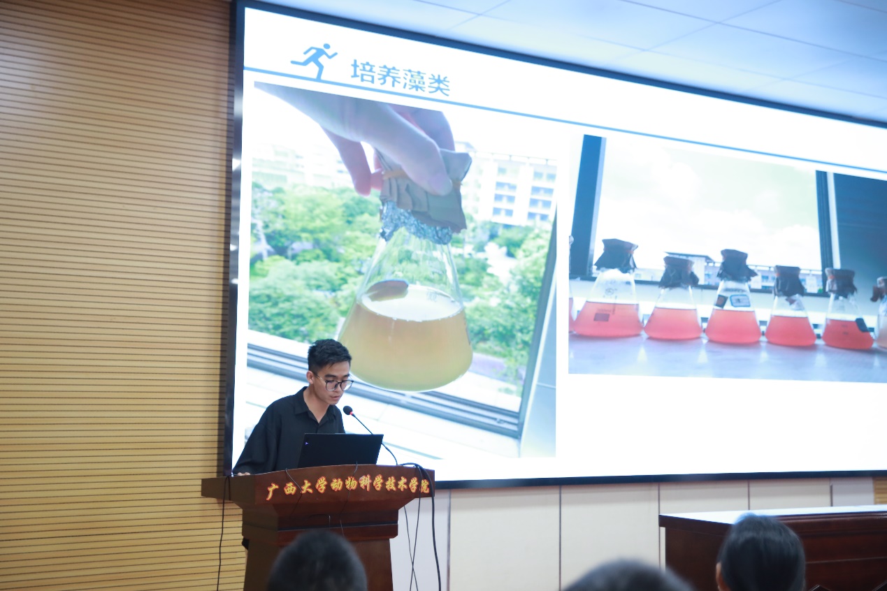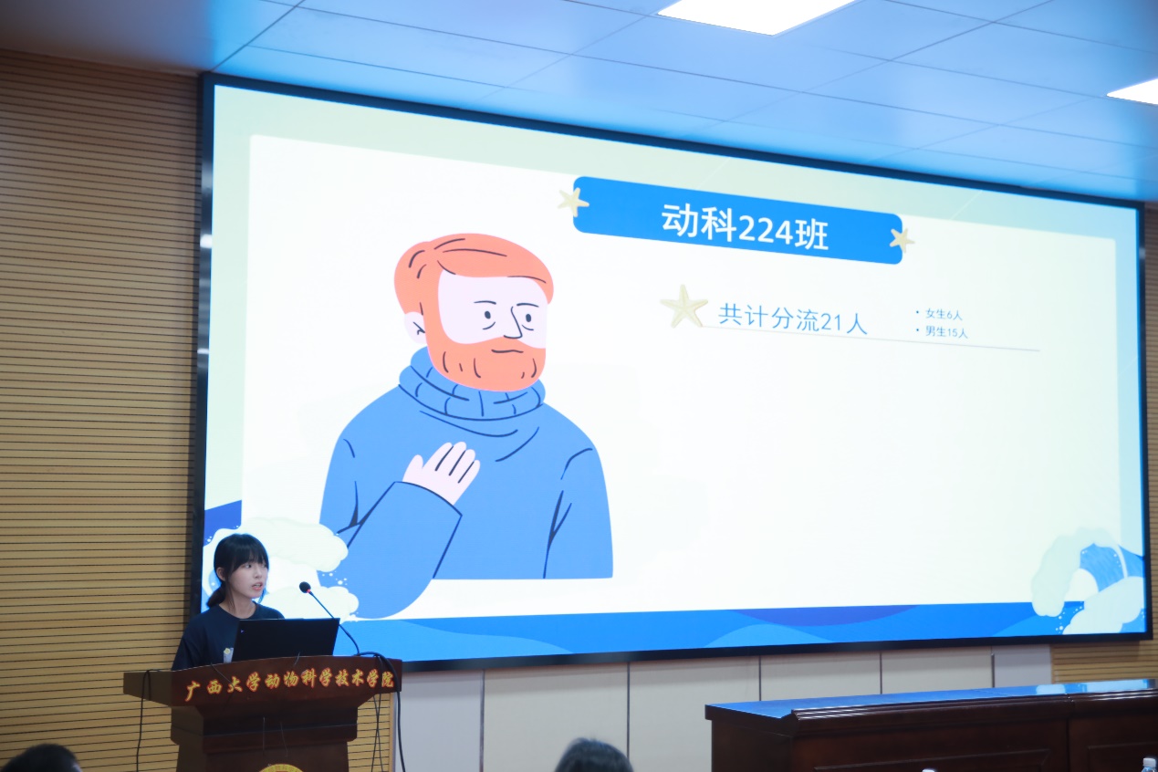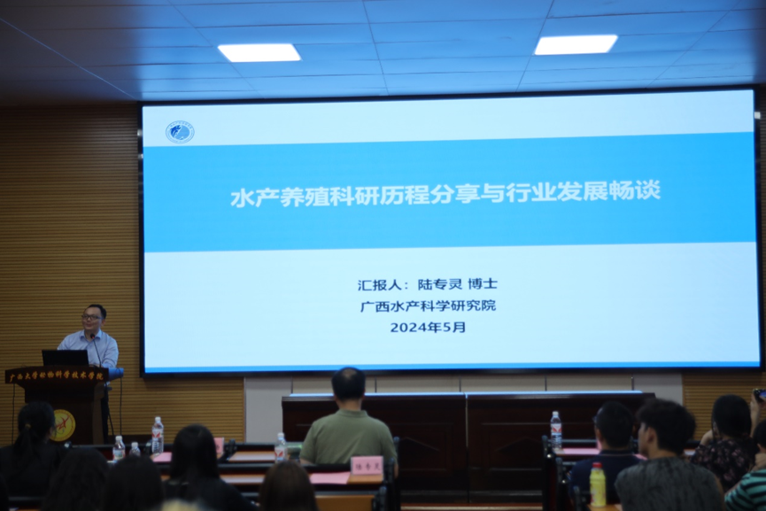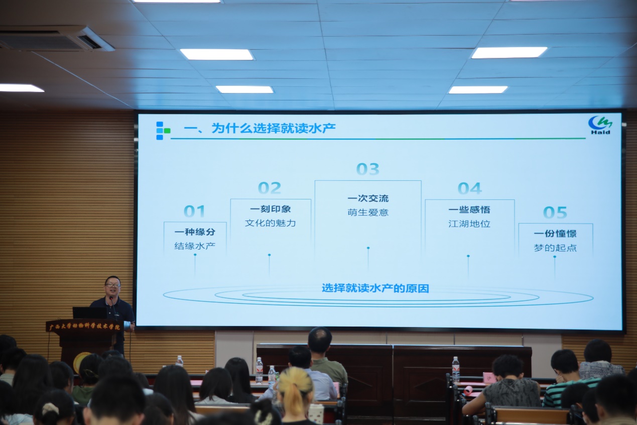 首先,水产学科负责人潘英教授为大家介绍水产学科发展、师资力量、教学条件和人才培养等基本情况,水产养殖方向的具体计划和培养方案,阐述水产养殖方向的职业发展优势。随后,广西水产科学研究院陆专灵副研究员分享其一路走来在水产行业取得的成果,并对水产未来的发展趋势做了详细的分析,为同学们构建了一个清晰的水产地图。紧接着,南宁海大生物科技有限公司水产线总经理黄东为大家解析水产行业的新发展以及大前景,最后还寄语给同学们,希望大家能学好水产,坚持传承下去。接下来,22级动物科学专业水产养殖方向班班长颜畅同学介绍了22级的分流情况,同时也向大家分享自己在水产方面的科研体验和自我提升感想。随后,渔业发展221班的在读研究生李昱达同学介绍了自己在水产学习方面精彩丰富的学习和生活经历,并热切欢迎小可爱们加入水产大家庭。