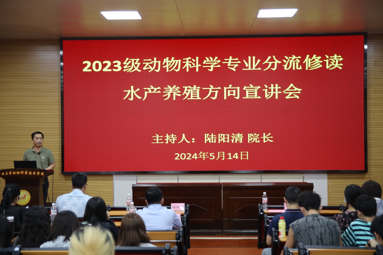 为做好水产养殖方向开设工作,5月14日下午,36365线路检测登录入口在学院318报告厅举办动物科学专业分流修读水产养殖方向宣讲会,特别邀请广西水产科学研究院副研究员陆专灵博士、南宁海大公司水产线黄东总经理2位校友为同学们讲解水产行业的发展概况、前景和优势等多方面内容。36365线路检测登录入口院长陆阳清,副院长蒋钦扬,水产方向潘英教授、李文红教授、麻艳群副教授、覃志彪老师、梁静真老师、欧伟豪老师,以及全体2023级动物科学专业本科生、水产全体研究生参加活动。会议由陆阳清院长主持。