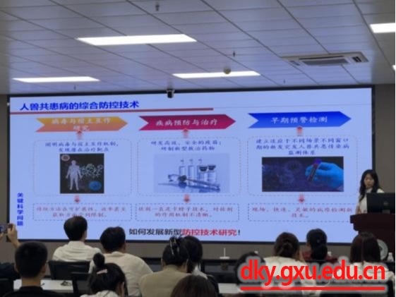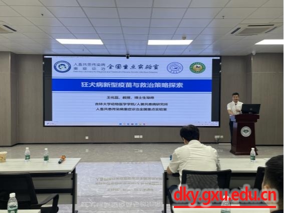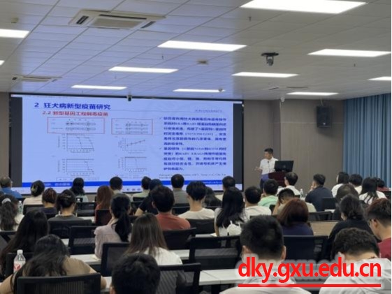 会上,王化磊教授围绕当前狂犬病的流行情况及危害、新型疫苗研究现状、救治药物研究进展、防控面临的难题等几方面,结合国际狂犬病防控现状和趋势,为师生详细介绍了狂犬病新型疫苗与救治策略。他表示,防控动物狂犬病是消除狂犬病的关键;表达树突状细胞刺激分子的重组狂犬病病毒、SARS-COV-2基因重组狂犬病病毒二联灭活疫苗等狂犬病新型疫苗具有良好的免疫保护效果;宿主蛋白TAB2可调控狂犬病病毒复制,可能是狂犬病治疗潜在靶点。王化磊教授强调预防狂犬病需提高意识、加强管理、联防联控。李媛媛教授从狂犬病病毒感染机制的可视化研究、聚集体纳米免疫佐剂的研究、聚集体光敏剂在狂犬病暴露后救治的应用研究与病毒体外可视化检测方法的建立这四个方面做了详细的分享。她勉励同学们要善于提出科学问题,勇于探索,选定研究方向,坚定信心不动摇、持之以恒做科研。