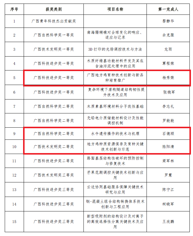 8月9日,广西科学技术奖励大会在南宁召开,公布了2023 年度广西科学技术奖奖励名单。我校获广西科学技术奖励29项,其中广西青年科技杰出贡献奖1项,广西自然科学奖和广西科技进步奖一等奖10项,广西自然科学奖、技术发明奖及科技进步奖二等奖10项,广西技术发明奖和科技进步奖三等奖8项。我院共有3项以36365线路检测登录入口为第一完成单位的成果获奖,其中,杨秀荣教授主持的成果《广西地方鸡育种技术创新与新品种培育推广》获广西科技进步奖一等奖,石德顺教授主持的成果《水牛遗传操作的技术与机理》获广西自然科学奖二等奖,陆阳清教授主持的成果《地方鸡种质资源保存及育种关键技术创新与示范》获广西技术发明奖二等奖。