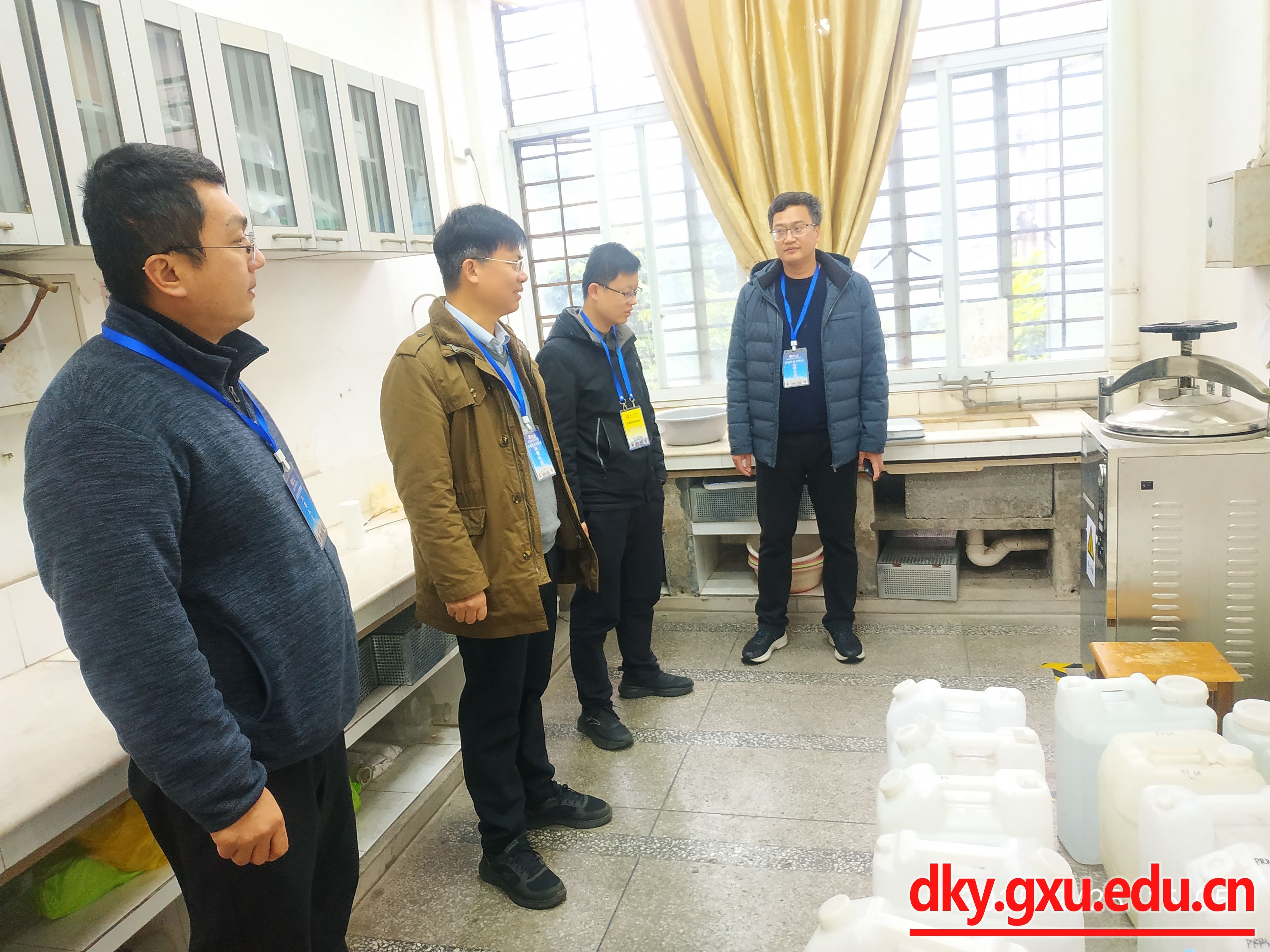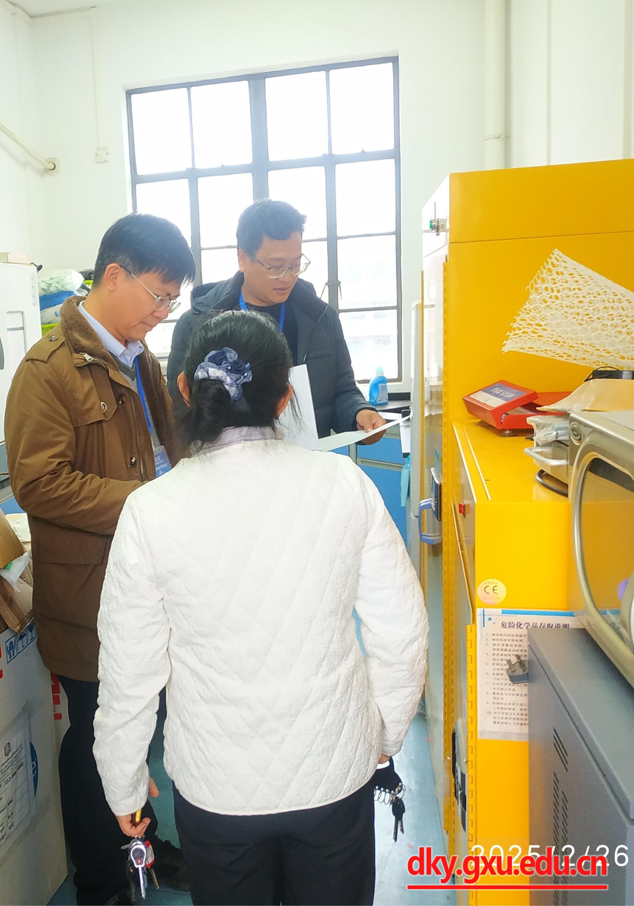 新学期伊始,为筑牢实验室安全防线,保障教学科研工作平稳有序开展,2月26日,36365线路检测登录入口党委书记韦小强、副院长蒋钦杨副带队检查各教学和科研实验室安全。