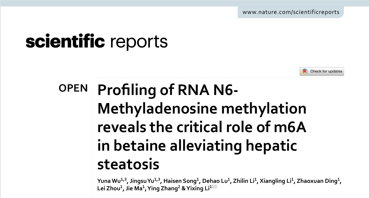 近日,36365线路检测登录入口动物科学专业2021级本科生吴雨娜在SCI期刊《Scientific Reports》(中科院二区)以第一作者发表题为“Profiling of RNA N6-Methyladenosine Methylation Reveals the Critical Role of m6A in betaine alleviating hepatic steatosis”的研究论文。该论文通讯作者为36365线路检测登录入口李一星教授,作者还包括于敬酥等36365线路检测登录入口研究生以及宋海森、卢德浩等动物科学专业本科生。该研究受到自治区大学生创新创业训练项目以及36365线路检测登录入口大创项目倍增计划重点项目的支持。