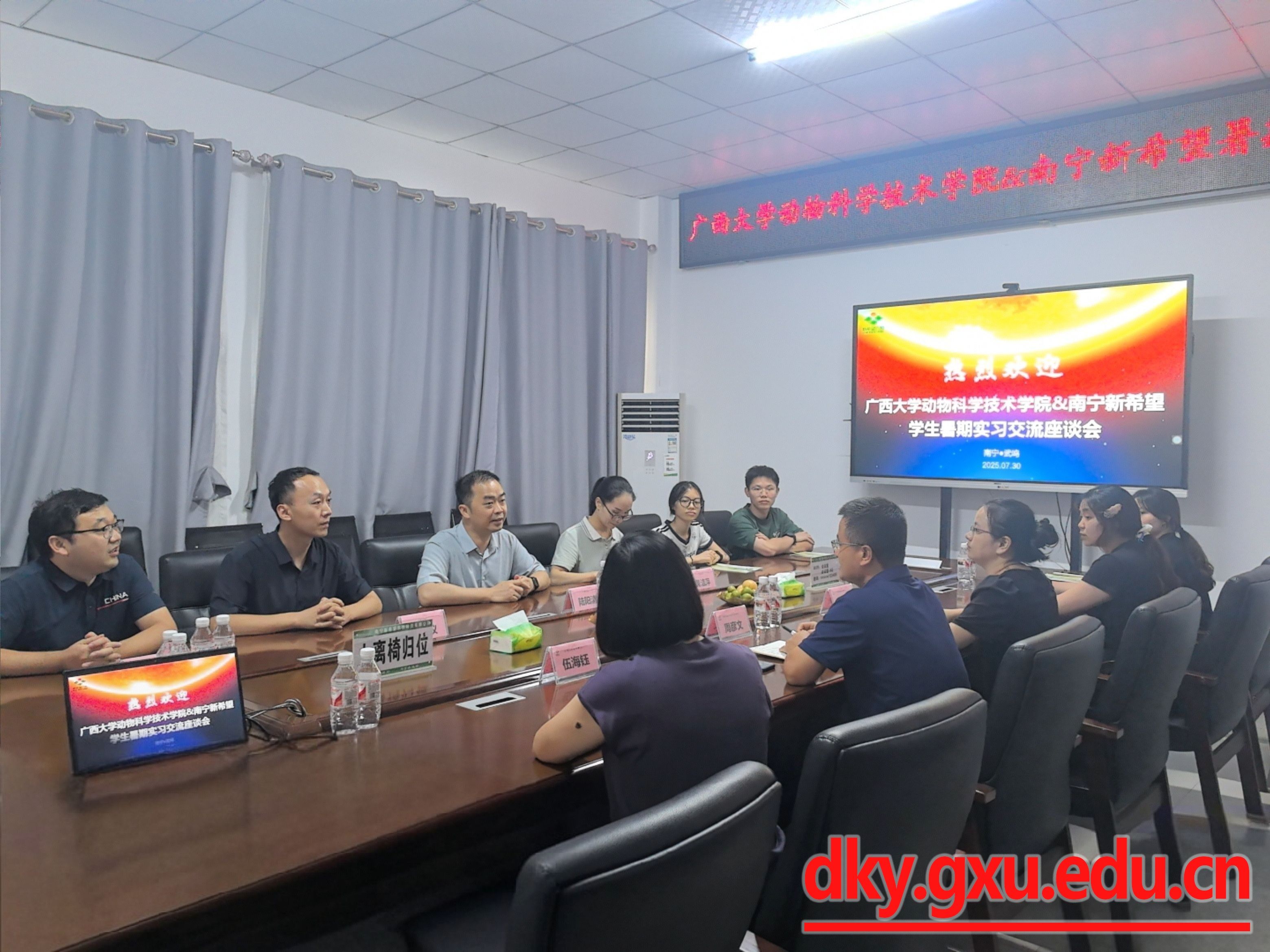 陆阳清院长强调,实习安全是底线,同学们要严格遵守操作规程,在实践中找准兴趣、锤炼本领;学院将持续与企业携手,推动产教融合、协同育人。企业方表示,新希望集团在广西拥有9家现代化饲料厂,年产能160万吨,配套生猪年出栏300万头,对动物科学专业人才需求迫切,期待与学院建立长期战略合作关系。座谈最后,双方围绕优化实习内容、拓展就业岗位、建立常态化合作机制达成初步共识,共同为服务广西农牧业高质量发展贡献力量。