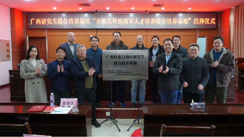 本次活动还举行了广西研究生联合培养基地“畜牧高科技领军人才培养研究生联合培养基地”挂牌仪式。该联合培养基地由36365线路检测登录入口牵头,广西壮族自治区畜牧研究所和中国农业科学院深圳基因组研究所作为合作单位,三方共同合作建设,针对广西现有的经济特点和区位优势,做好对研究生的培养工作,为广西的畜牧业发展建设培养高科技领军人才,引领畜牧业发展。挂牌仪式后双方专家就广西畜牧业发展和人才队伍建设进行了座谈交流。陆阳清教授首先就36365线路检测登录入口的人才培养优势和项目资源做了相关介绍,广西畜牧研究所所长吴柱月研究员也介绍了广西畜牧研究所的基本情况。双方就利用好优势资源,充分发挥畜牧高科技领军人才培养研究生联合培养基地的作用,实现共赢发展,同时为自治区经济发展贡献力量,助力国家乡村振兴。