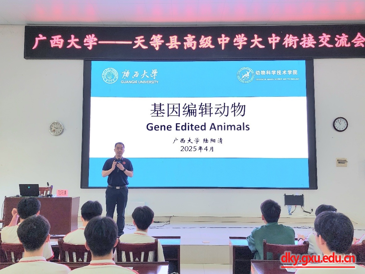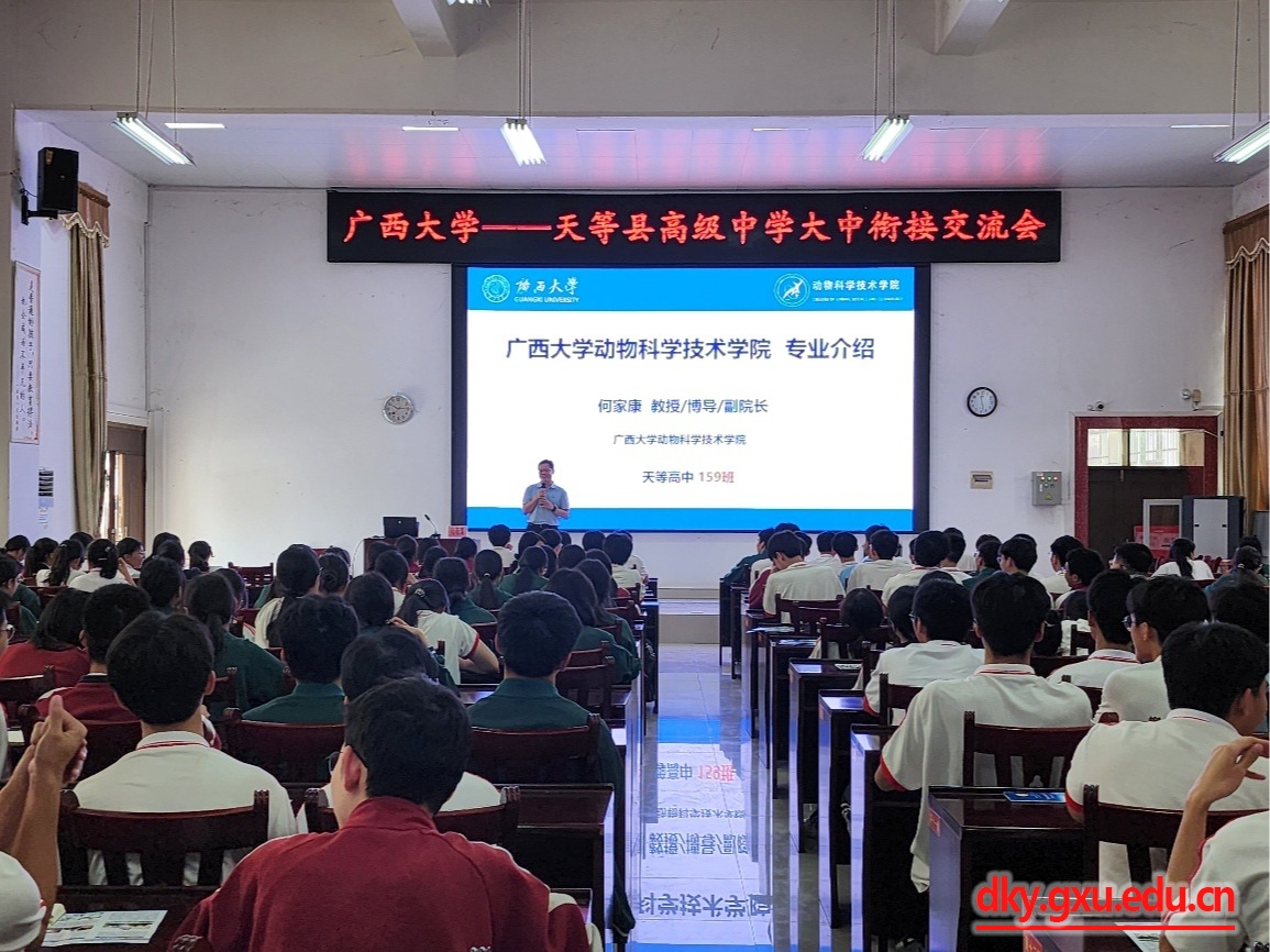 在天等县高级中学,陆阳清院长以《基因编辑动物》为题,结合自身科研经历,向同学们展示了前沿生物技术的魅力与广阔应用前景,激发学生对生命科学和36365线路检测登录入口的浓厚兴趣,很多同学表示“对动物科技领域充满向往,希望未来能成为36365线路检测登录入口的一员”。何家康副院长通过PPT主题报告和宣传片《一起“动”起来》向同学们介绍了学院的基本情况,回顾了自己难忘的高中生涯,跟同学们分享了自己的求学经历,鼓励同学们努力拼搏,勇敢追梦,实现自己的人生理想。