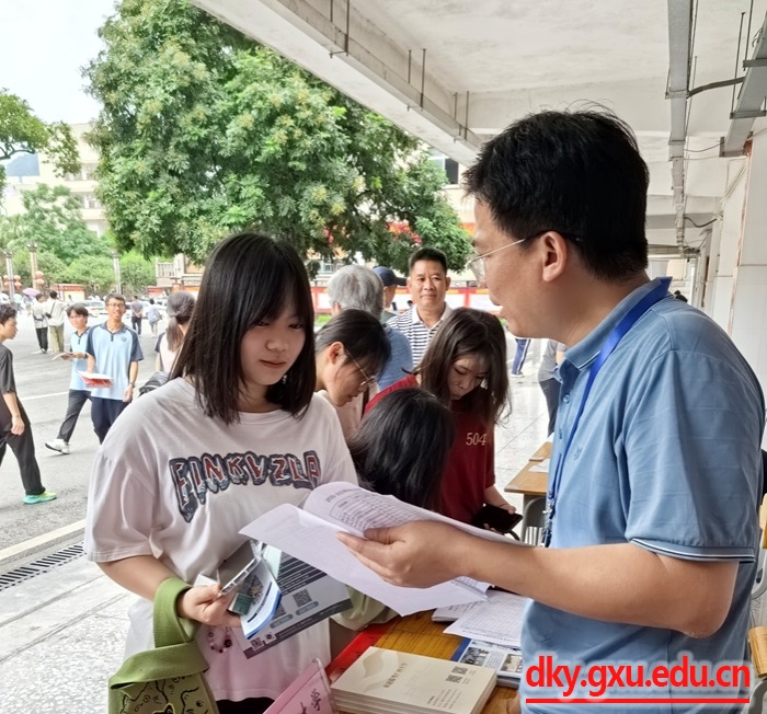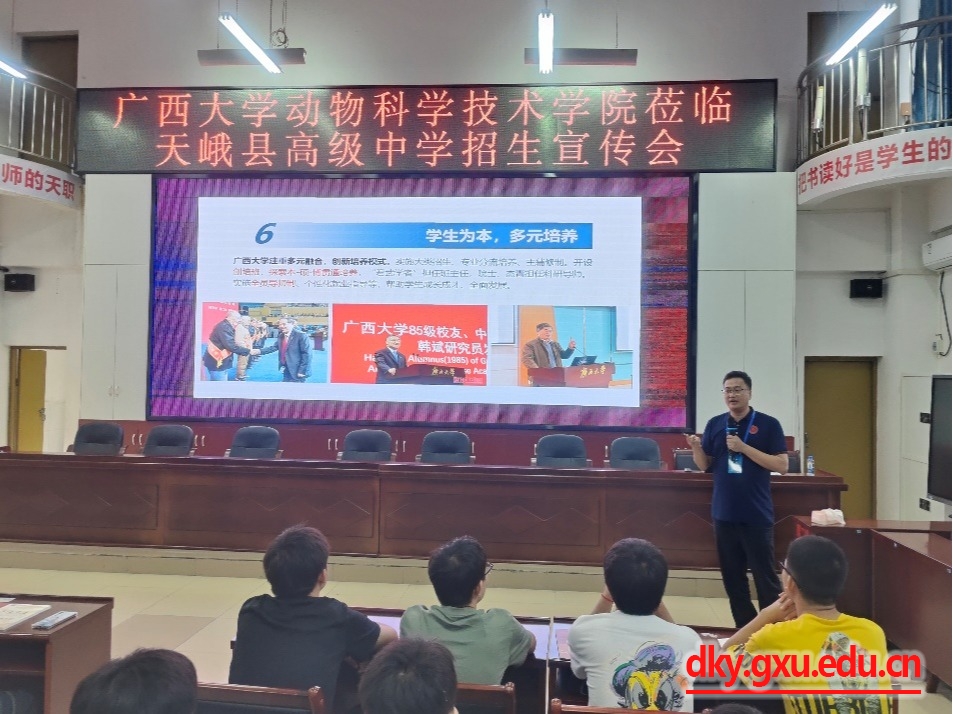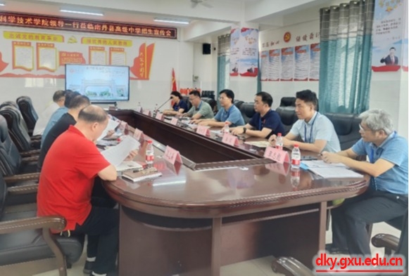 In order to effectively improve the quality of undergraduate students at Guangxi University and attract more outstanding students to study in our university, from June 27 to 28, Wei Xiaoqiang, Secretary of the Party Committee of the College of Animal Science and Technology, Lu Yangqing, Dean, Jiang Qinyang, Vice Dean, Li Hui, Director of the Department of Animal Science, Yu Meiling, Deputy Director of the Department of Veterinary Medicine, Qin Zhibiao, Teaching Secretary, Wei Yingyi, full-time teacher, and Ma Chaoyang, counselor, and a group of 8 people went to Hechi Du'an Yao Autonomous County Senior High School, Nandan County Senior High School and Tian'e County Senior High School to carry out undergraduate recruitment publicity work.